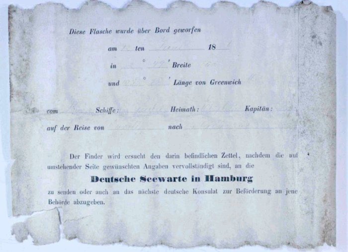 Do outro lado da nota havia um questionário, onde quem encontrasse a garrafa anotaria quando e onde a garrafa foi encontrada e, em seguida, enviaria a nota de volta para o Observatório Naval Alemão em Hamburgo ou para o Consulado Alemão mais próximo.