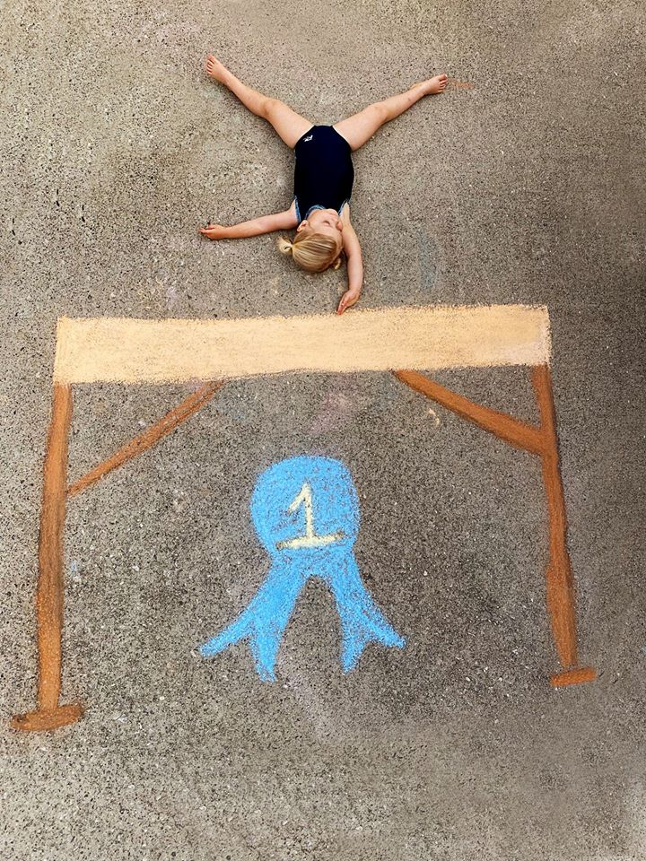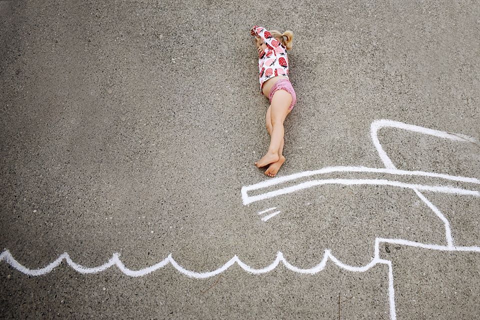 Com a ajuda de um simples giz na calçada, a menina de 3 anos percorre montanhas-russas, desliza nos escorregadores e sobrevoa prédios enquanto usa uma capa.