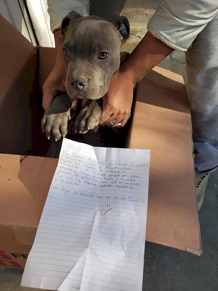 Um cachorro foi deixado na porta de um abrigo para animais no México. Dentro da caixa, o filhote estava com um bicho de pelúcia e uma carta que comoveu os funcionários da organização.