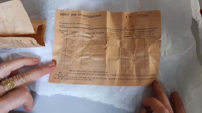 A mensagem, escrita no verso de dois cupons de atividades então conhecidas como Dienst der Stadsgebouw , foi compartilhada pelas autoridades da cidade de Antuérpia por meio de suas redes sociais.
