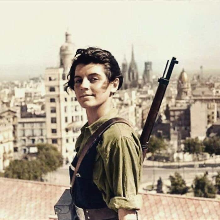 #19 Marina Ginestà, uma ativista social, jornalista e tradutora de 17 anos, no terraço do Hotel Colón em Barcelona em 1936.