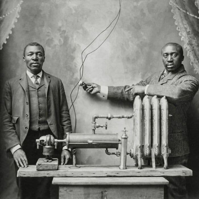 #8 Fotografia mostrando o inventor Charles Sl Baker e seu assistente demonstrando o sistema de aquecimento/radiador. 1906