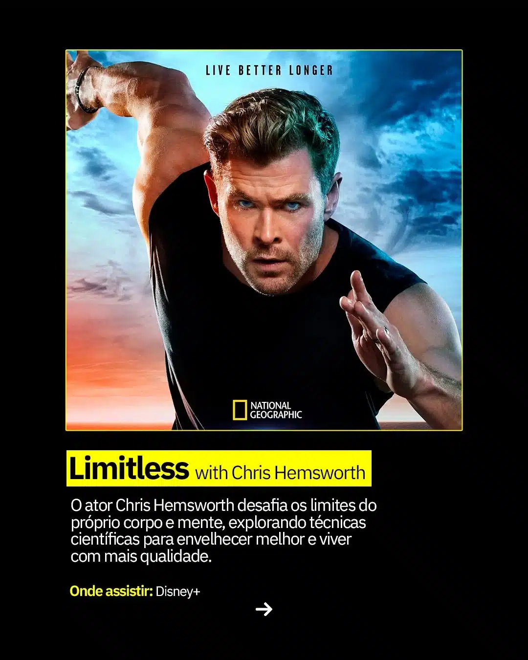 Nesta série da National Geographic, o ator Chris Hemsworth embarca em uma jornada pessoal para descobrir como podemos estender nossa longevidade e potencial humano.