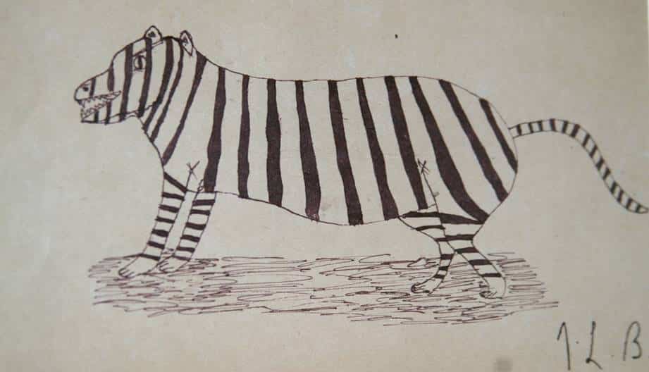 Após deterioração progressiva de sua visão, ele ficou totalmente cego aos 55 anos. A única obra sobrevivente da qual tenho conhecimento é esta representação primitiva e apropriadamente fantástica de um tigre. Incluo porque é de Borges e pelo significado que o tigre tinha para ele.