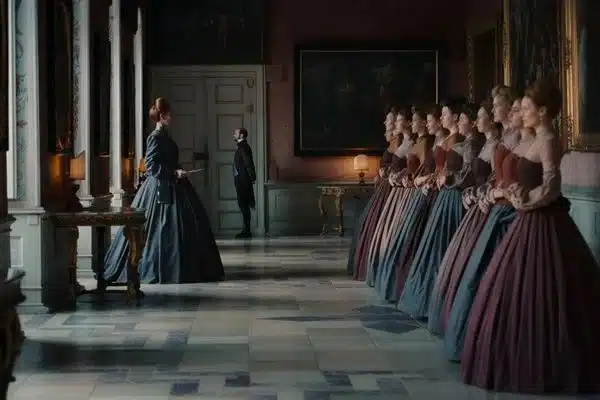 A produção visual de “A Imperatriz” é impressionante, com cenas de palácios e salões suntuosos, acompanhados por figurinos ricos em detalhes que ajudam a construir os personagens, incluindo vestimentas masculinas coloridas que reforçam a vaidade dos membros da corte.