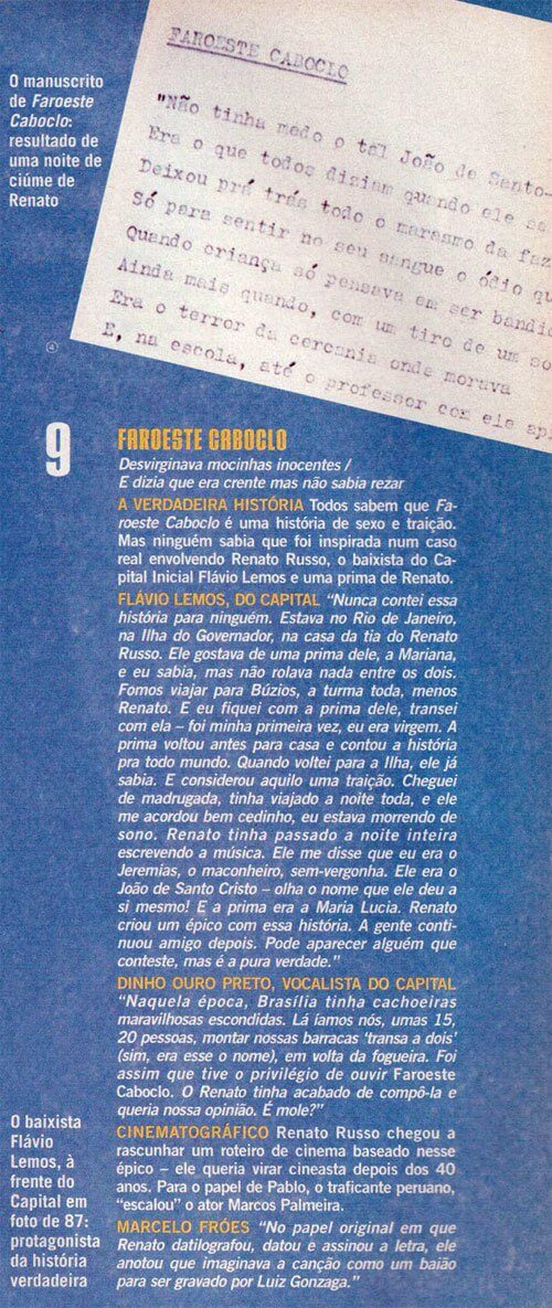Nunca saberemos a opinião de Renato Russo sobre a adaptação cinematográfica dirigida por René Sampaio, e tampouco sobre Somos Tão Jovens, o filme de Antônio Carlos Fontoura que levou mais de 1,5 milhão de espectadores aos cinemas, com um surpreendente Thiago Mendonça no papel do vocalista da Legião Urbana. Quem assistiu à cinebiografia certamente lembra de Flávio Lemos, retratado no filme como objeto de paixão platônica de Renato, e que foi um dos integrantes do Aborto Elétrico antes de integrar o Capital Inicial junto com seu irmão Fê Lemos. Pois bem: em entrevista concedida a Cláudia de Castro Lima para a revista Flashback, em 2004, Flávio afirmou que “Faroeste Caboclo” foi inspirada por ele e por uma prima de Renato, Mariana. E que João de Santo Cristo seria um alterego do próprio Renato Russo nesse bizarro triângulo amoroso. Será? Confiram abaixo um trecho escaneado dessa matéria da Flashback.