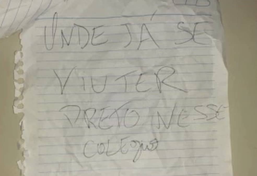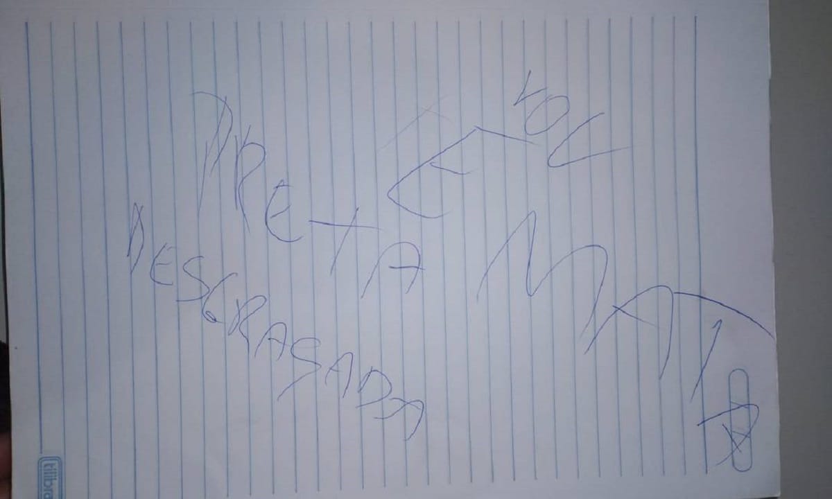 Porém, sete dias depois, uma nova ofensa foi deixada nos materiais da menina, desta vez acompanhada de uma ameaça: ‘Vou te matar, preta desgraçada”.