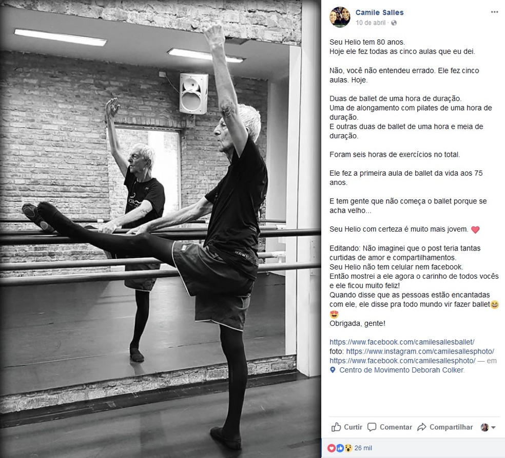 “Ele nem viu que eu tirei essa foto, não foi planejada e ficou muito bonita, expressiva. De repente, me deparei com uma publicação de muito amor, as pessoas muito inspiradas. Foi uma coisa louca, inspiradora. Eu li vários comentários, porque ele não tem Facebook, e escolas de dança do Brasil inteiro mandaram um beijo, disseram que ele era uma inspiração”, disse Camile.