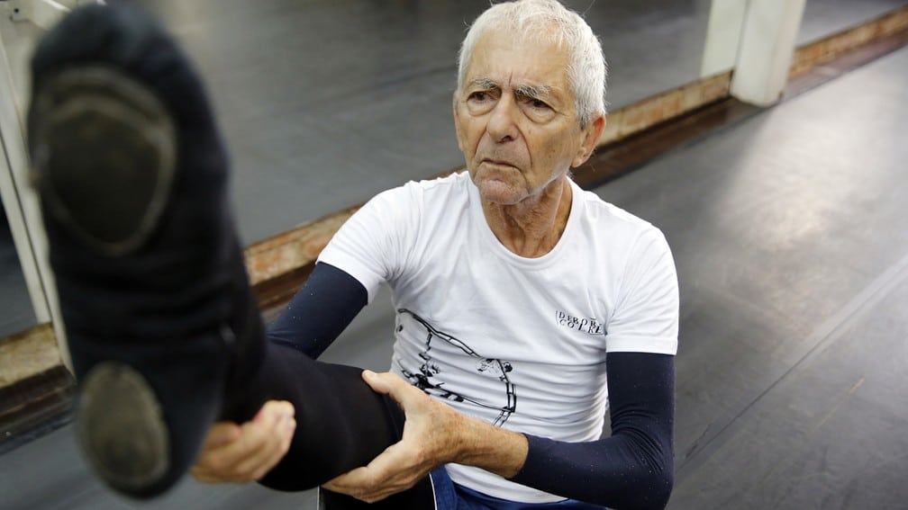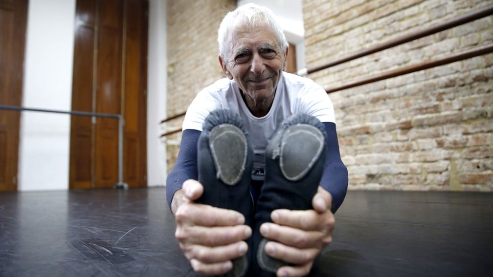 Praticando 5 aulas por dia, uma delas sendo de um módulo de balé clássico com mais de meio milênio de existência, a dança italiana, Seu Hélio chega por volta das 9h a uma academia da Glória, no Rio de Janeiro (RJ), onde inicia os alongamentos.