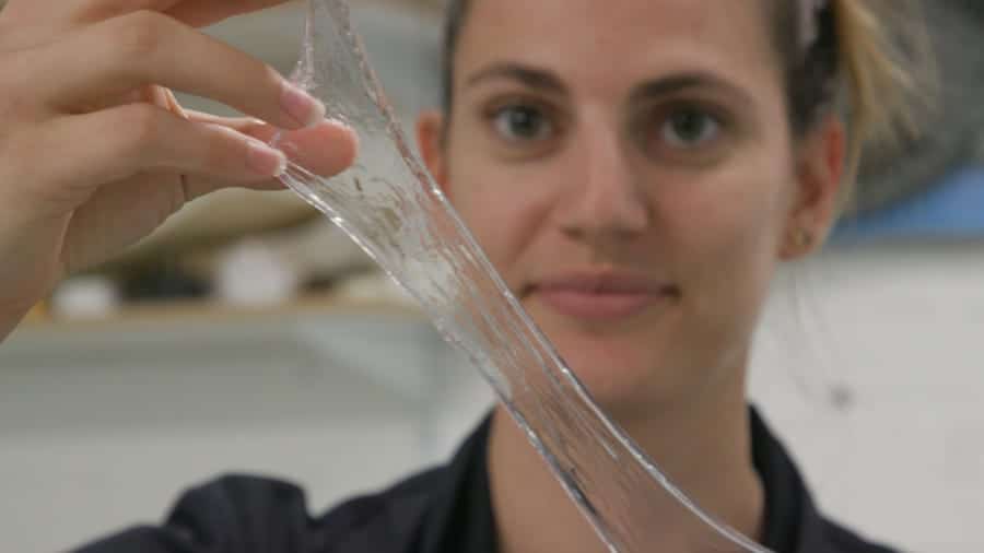 A membrana é feita de algas marinhas cultivadas no norte da França. Ele é seco e moído até virar pó, e então uma receita secreta o transforma em um fluido espesso e pegajoso, que seca para formar uma substância parecida com plástico.