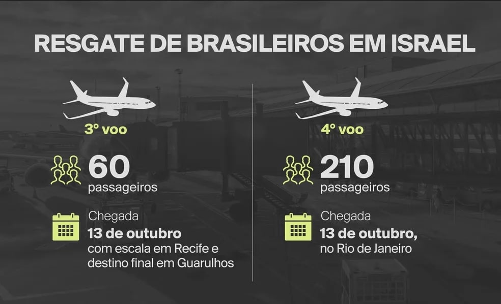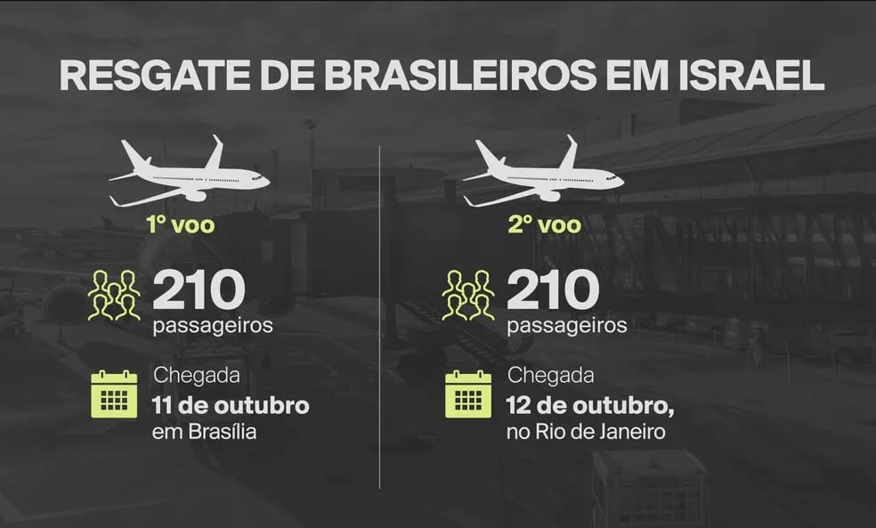O primeiro voo de repatriação de brasileiros nas áreas afetadas pelos conflitos em Israel foi executado pela Força Aérea Brasileira (FAB), decolando do Aeroporto Internacional de Tel Aviv nesta terça-feira, dia 10 de outubro.