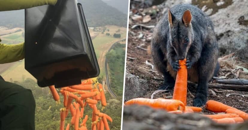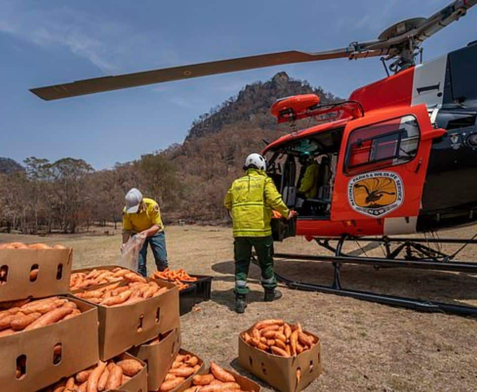 Aeronaves estão sendo usadas para jogar milhares de quilos de cenoura e batata-doce para os animais selvagens famintos presos em meio à crise dos incêndios florestais na Austrália.