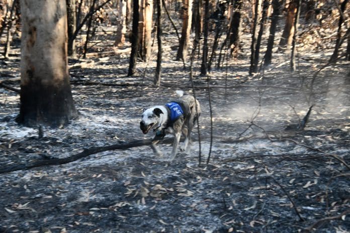 O canino de trabalho foi recentemente enviado para várias áreas queimadas na Austrália para ajudar os Serviços de Emergência e Bombeiros de Queensland: QFES, Queensland Koala Crusaders e Wildcare Australia Inc. encontram coalas que podem ter sido feridos nos incêndios e agora precisam desesperadamente de ajuda.