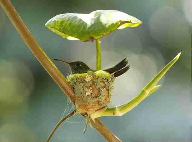 Os beija-flores são um dos mais inteligentes de todos, e um pequenino no Paraguai construiu seu ninho à sombra de uma folha larga, que serve como teto, como forma de proteger seus filhotes.
