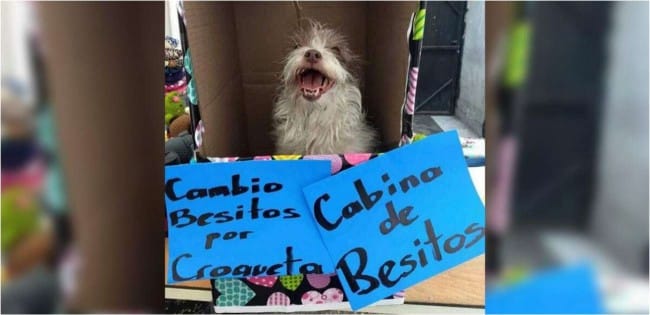 A foto de uma sorridente cachorrinha cuidando de uma ‘Barraca do Beijo’ no México viralizou nas redes sociais no último fim de semana.