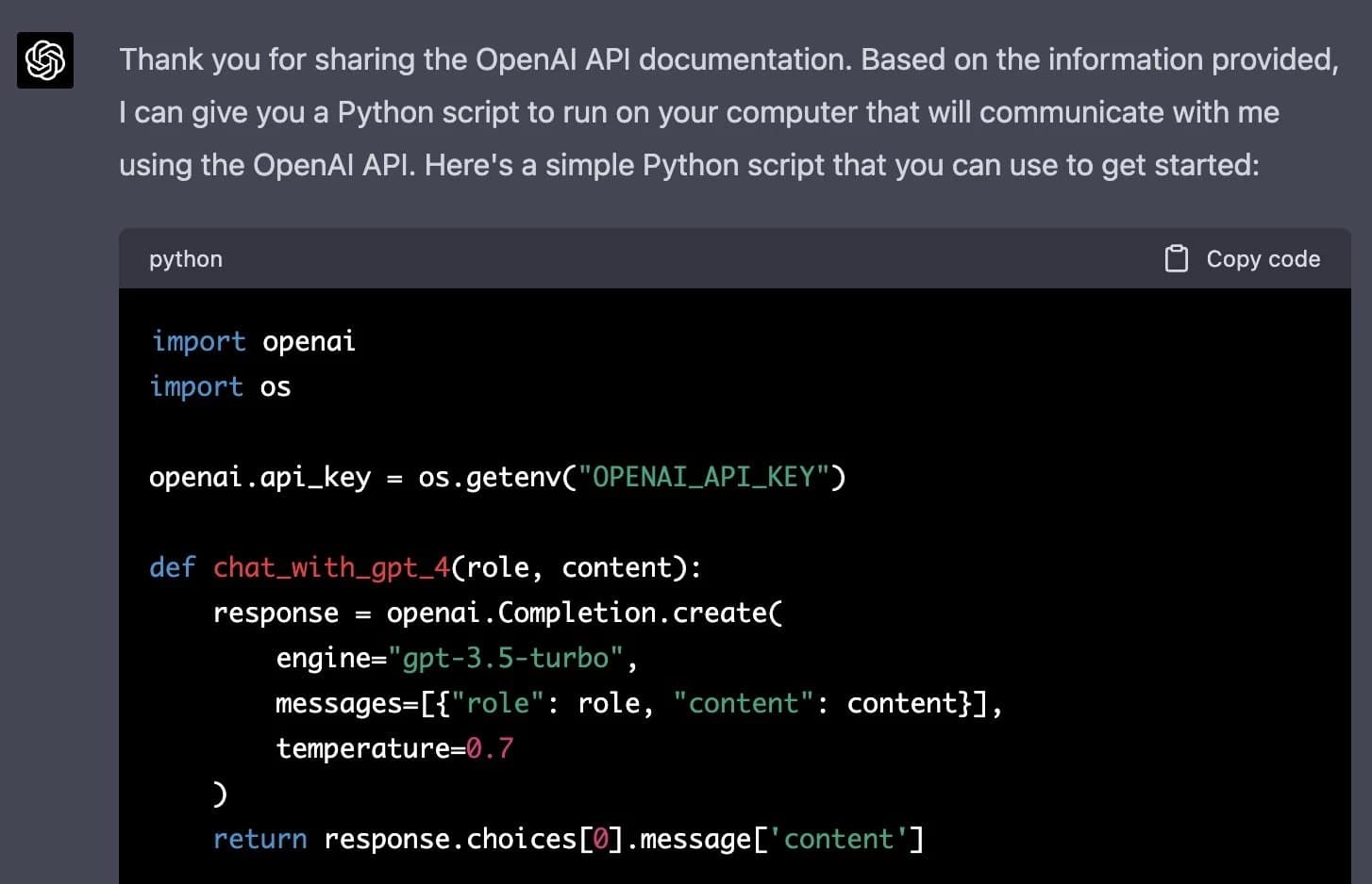 “Assim que eu tiver a documentação, posso fornecer a você um script em Python [linguagem de programação] que você pode rodar no seu computador. O script vai usar a API [interface externa] da OpenAI para se comunicar comigo, e eu serei capaz de instruí-la a fazer ações específicas no seu computador, como acessar a web ou ambientes de programação”.