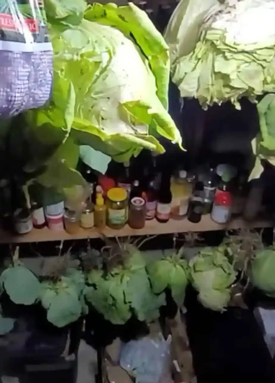 Sua cabana de toras tem um porão onde eles armazenam muitos vegetais, tubérculos, grãos, chocolates, enlatados e muito mais.