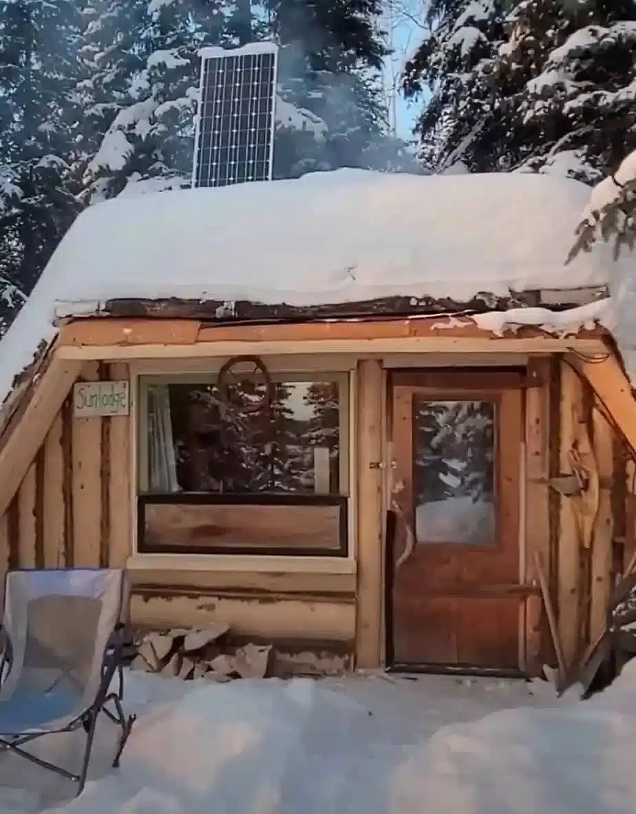 Ele e Jenna cavaram fundo na colina para aproveitar o calor relativo da terra, usaram muitos troncos de abeto para revestir a casa, cobriram-na com grama para isolamento e garantiram que ela estivesse voltada para o sul para obter ganho solar passivo.