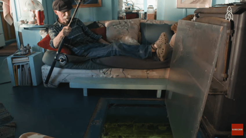 Catherine lhes daria arte e, por sua vez, ela pediria tudo o que eles tivessem em seu quintal. Um exemplo é esta parcela que eles têm no chão da sala – um pedaço de Plexiglass do Victoria Hockey Rink. O vidro transparente permite que Wayne o levante e pesque sentado em seu sofá.