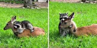 Guaxinim e cervo, ambos órfãos, tornam-se melhores amigos