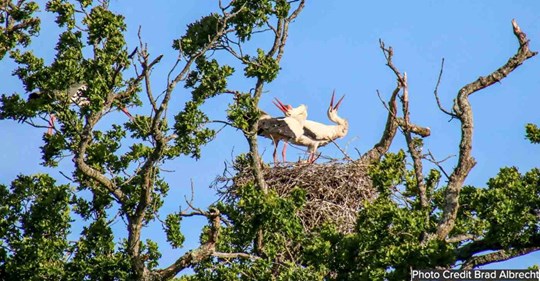 166 cegonhas brancas reabilitadas da Polônia, bem como um pequeno número de outras do norte da França, foram libertadas nessas currais ao longo dos últimos três anos, a fim de estabelecer populações locais de reprodução, com base na abordagem bem-sucedida usado para restaurar populações de cegonhas brancas na Europa nos últimos 50 anos.