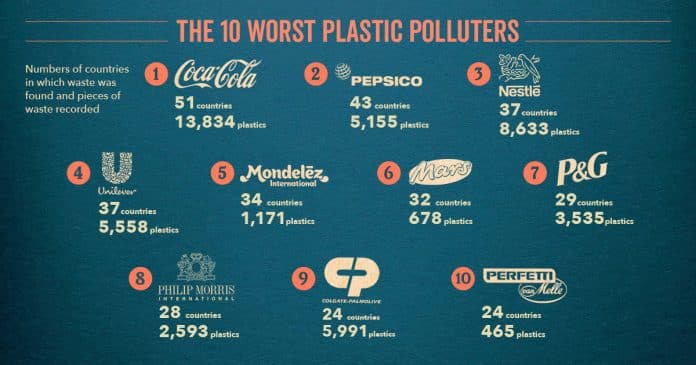Um total de 13.834 resíduos de plásticos da marca Coca-Cola foi registrado em 51 países. Isso é mais plástico do que a soma dos outros dois grandes poluidores globais combinados. A seguir está PepsiCo com 5.155 resíduos plásticos encontrados em 43 países e Nestlé com 8.633 em 37 países. De acordo com o dossiê, apesar das boas intenções, houve um aumento no número de produtos plásticos em relação ao ano passado.