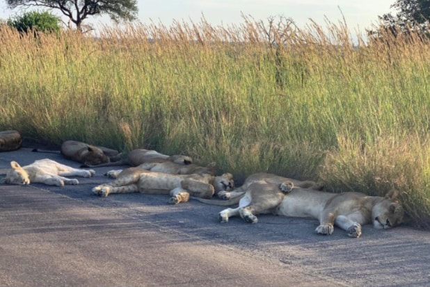 Os humanos não estão mais com seus carros e os leões do Parque Nacional Kruger, na África do Sul, aproveitam-se para tirar uma boa soneca diretamente nesta estrada, que geralmente é ocupada por turistas.
