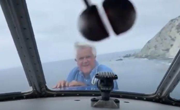 Porém, a cena é completamente verdadeira. James Douglas Muir Leno, conhecido como Jay Leno, está a bordo de um clássico Grumman HU-16 Albatross, um avião bimotor radial anfíbio da década de 1940.