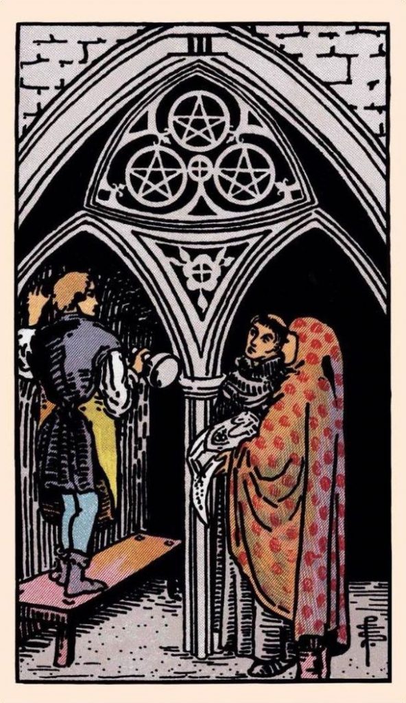 Ouros são os naipes da Terra, representativos da estrutura e da fundação. Os designs influenciados pelo teatro de Colman-Smith aqui identificam as ocupações de três figuras de pé em uma abside do que parece ser uma catedral: um carpinteiro com ferramentas nas mãos; um arquiteto mostrando planos para o grupo; um monge tonsurado, claramente o administrador do projeto de construção.