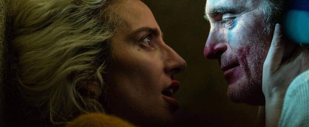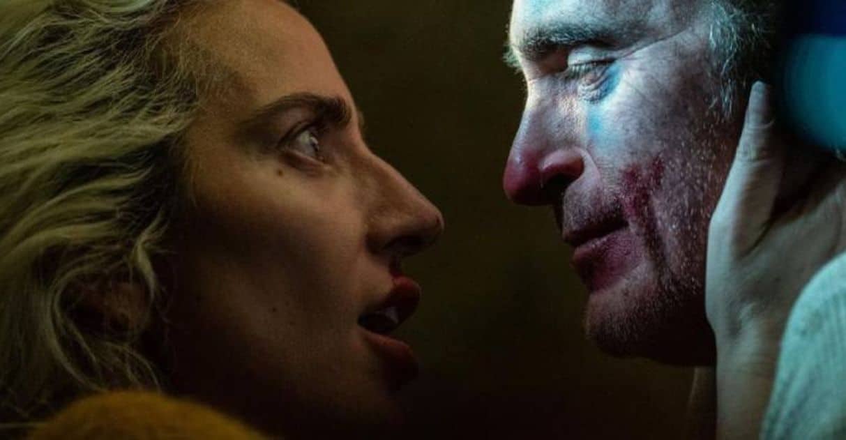 Na imagem, Lady Gaga aparece dando vida à Arlequina ao lado de Joaquin Phoenix como o icônico personagem. Ela parece estar sendo pressionada contra a parede, surpreendida, enquanto o Coringa a observa com um olhar zeloso – talvez apaixonado.