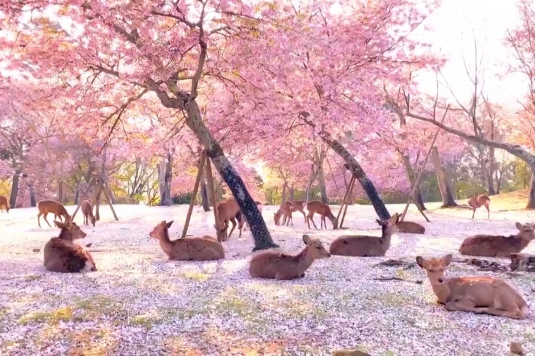 No dia seguinte, alguns espectadores decidiram dar um passeio no parque e o que encontraram foi a imagem idílica de dezenas de cervos descansando sob as árvores floridas.