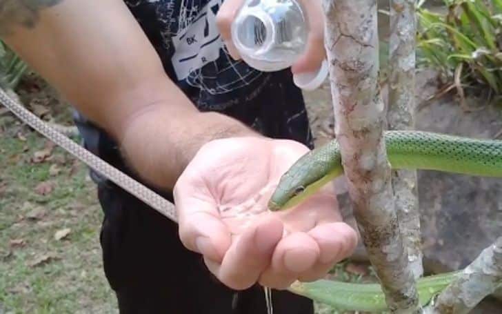 O homem derramou água na mão em concha e puxou a cobra não letal em sua direção. A cobra sedenta aceitou a oferta e lambeu com gratidão a água oferecida.
