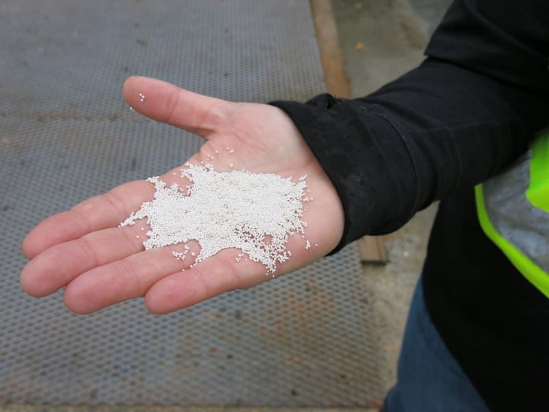 Em seguida, mais produtos químicos são adicionados e a solução é aquecida para criar pellets brancos que se parecem com o recheio de cadeiras de feijão. Eles contêm cerca de 50% de CO2.
