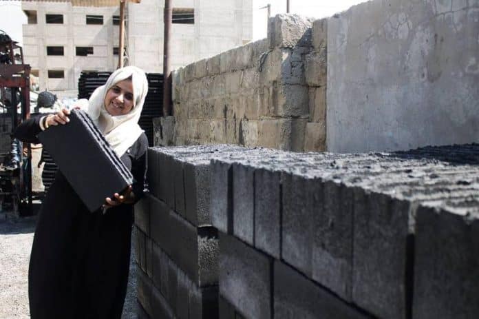 Ela diz que os blocos de cor preta são chamados de “verdes” porque desviam as cinzas do aterro, onde danificam o solo de Gaza, e “endurecem” por causa das bolsas de ar no bloco acabado.