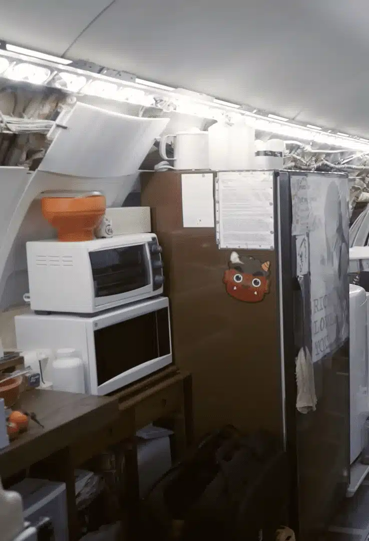 Demorou dois anos e aproximadamente $ 15.000 para transformar o avião. O engenheiro eletricista acrescentou um chuveiro improvisado, pia temporária, máquina de lavar portátil, geladeira e carrinho de serviço de alimentação de outro avião que serve como despensa.