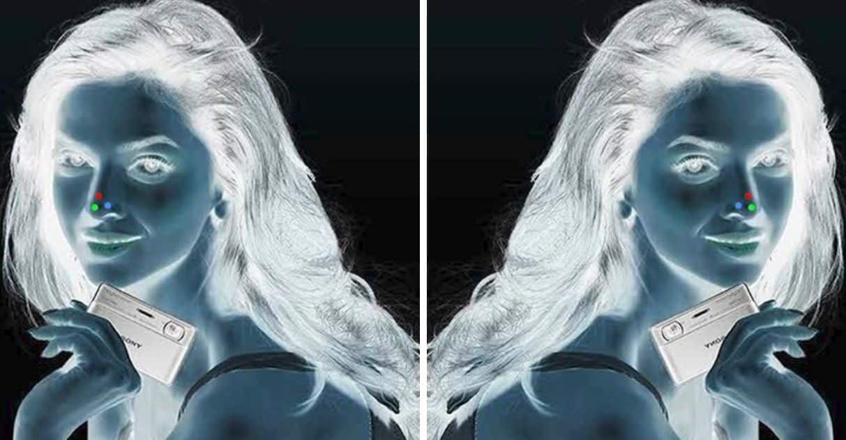 Funciona assim: olhe fixamente para os três pontos coloridos no nariz da moça que aparece na imagem. Mantenha o foco por cerca de 30 segundos. Não desvie o olhar nesse tempo!
