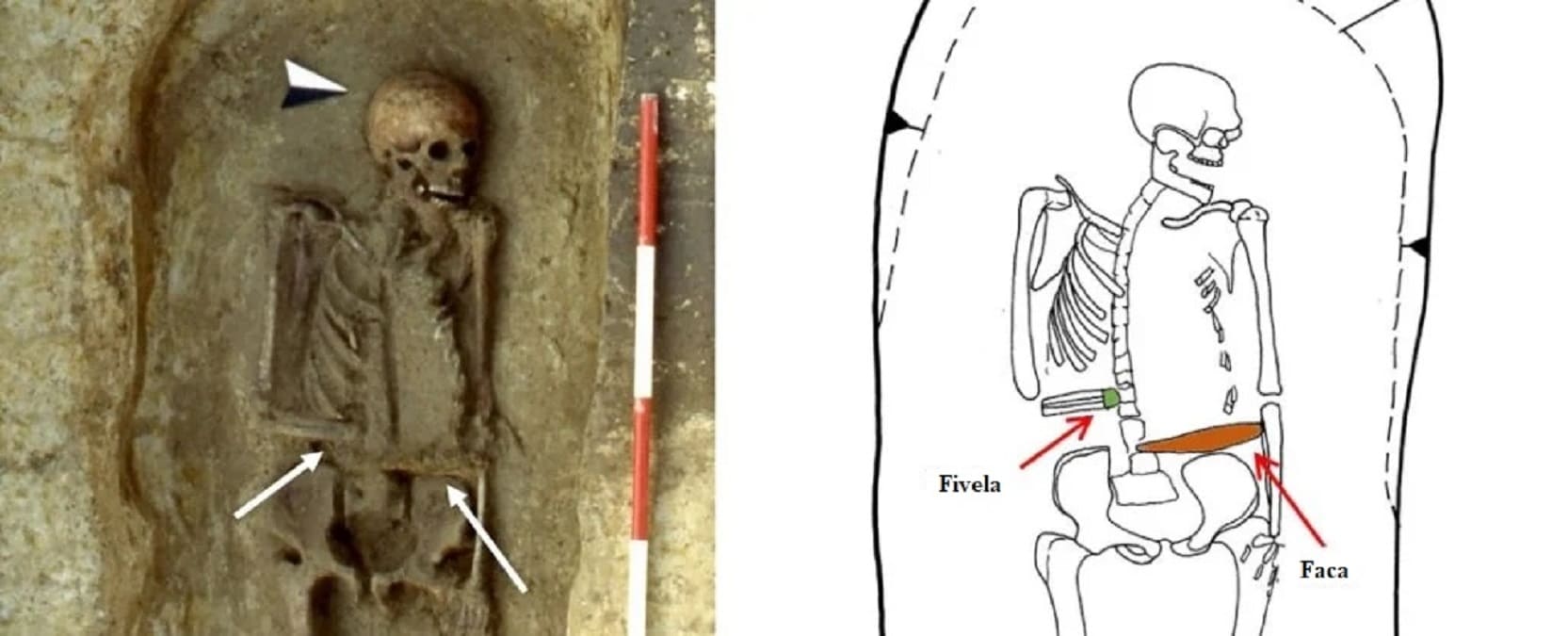Todos os outros enterros masculinos com facas no local estavam com os braços e as armas ao lado do corpo. Mas não esse cara.