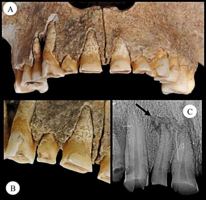Outras evidências sobre o esqueleto apoiam essa hipótese. Os dentes do homem apresentavam desgaste extremo – uma enorme perda de esmalte e uma lesão óssea. Ele tinha desgastado os dentes tão profundamente no lado direito da boca que provavelmente abriu a cavidade pulpar, causando uma infecção bacteriana.