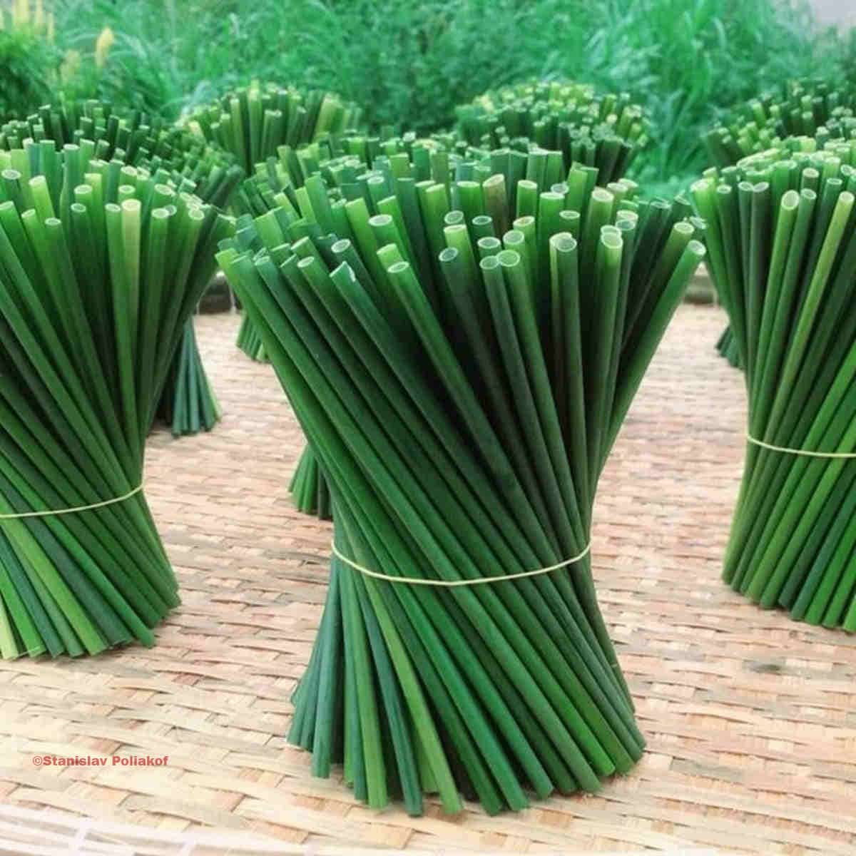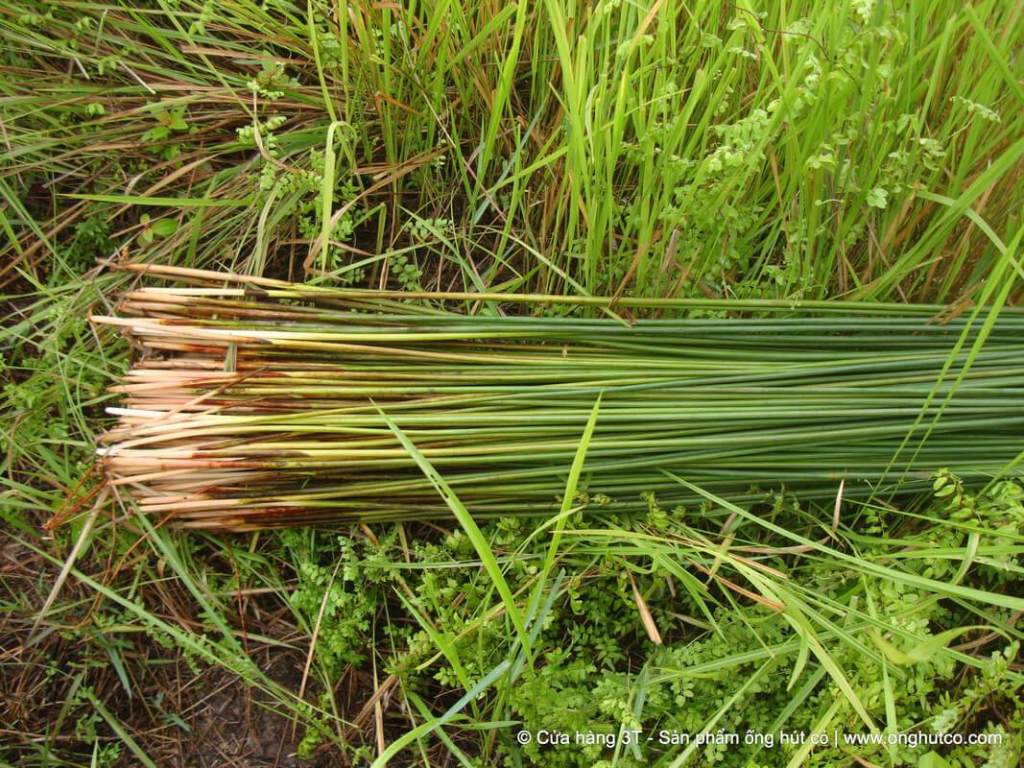 O capim oco, para ser mais preciso, é cultivado e colhido manualmente no maravilhoso delta do Mekong, no Vietnã, e depois cortado (o capim é regenerado dentro de um ano) em seções de cerca de 20 centímetros e desinfetada por ebulição, sem o uso de produtos químicos agressivos.