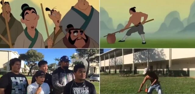Em 38 segundos de vídeo eles recriam, de maneira hilária, as cenas da música I’ll Make a Man Out of You (Não vou desistir de nenhum). A jovem que postou o vídeo no Twitter informa que a “brincadeira” é na verdade um trabalho escolar.