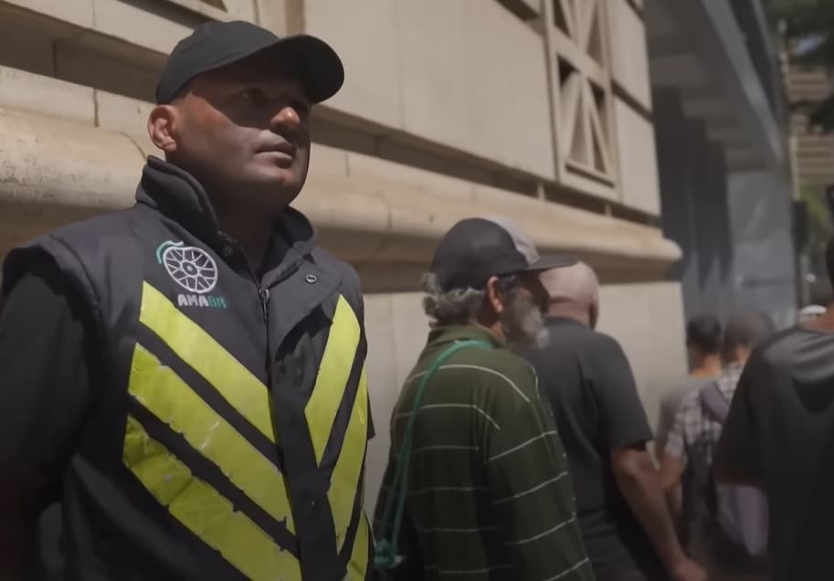 Ele enfrenta longas filas diárias para pegar sopa em uma ONG.
