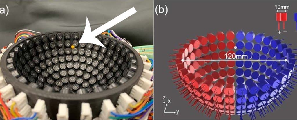 Os engenheiros Shota Kondo e Kan Okubo, da Universidade Metropolitana de Tóquio, no Japão, descobriram como construir uma matriz acústica hemisférica que pode levantar uma bola de poliestireno de 3 milímetros de uma superfície reflexiva.