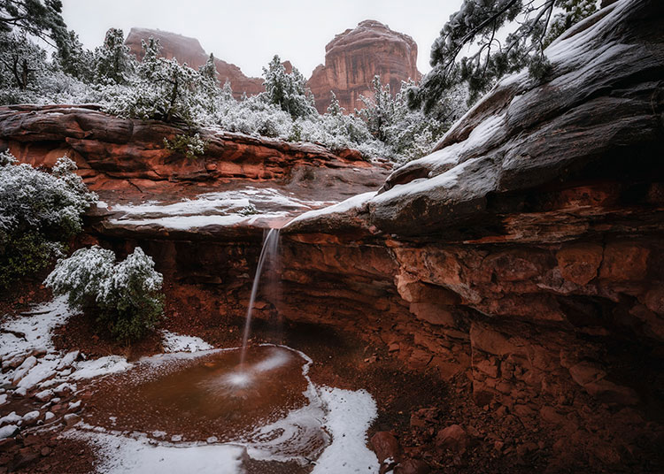Vencedor do terceiro lugar: Uma pequena cachoeira aparece no arenito de Sedona após uma tempestade de inverno — Foto de Michael Wilson