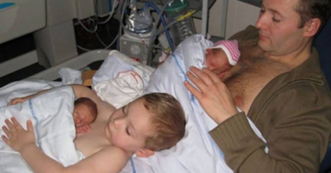 Foi legendado: “O contato pele a pele não é ‘novo’, mas a Suécia certamente abre caminho para tornar esse cuidado familiar, mesmo para bebês muito pequenos. Eu amo essa foto do irmão mais velho ajudando o pai a cuidar dos gêmeos! ”
