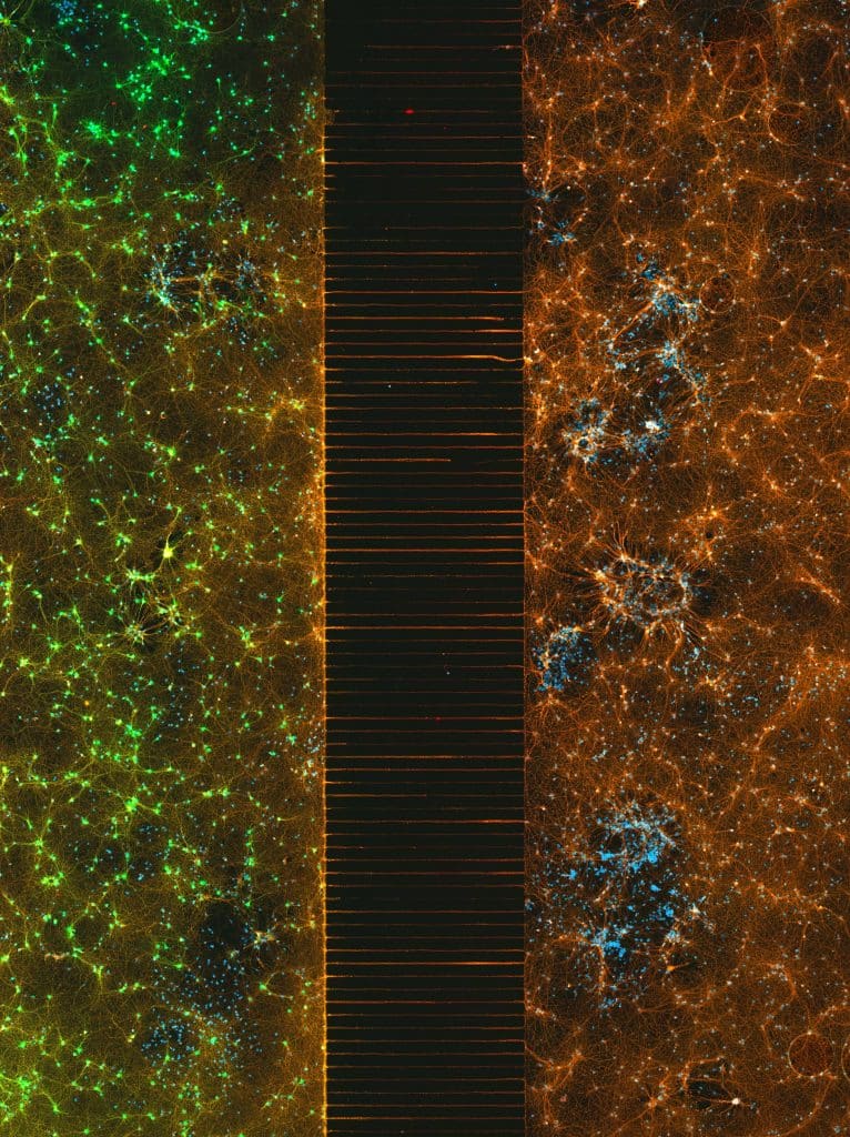 Com o tempo, as duas redes cresceram juntas por meio de uma ponte de axônios. Imunocorada, a conexão cria um gradiente geral lindo, brilhando de laranja a verde com manchas azuis pontilhadas por toda parte.