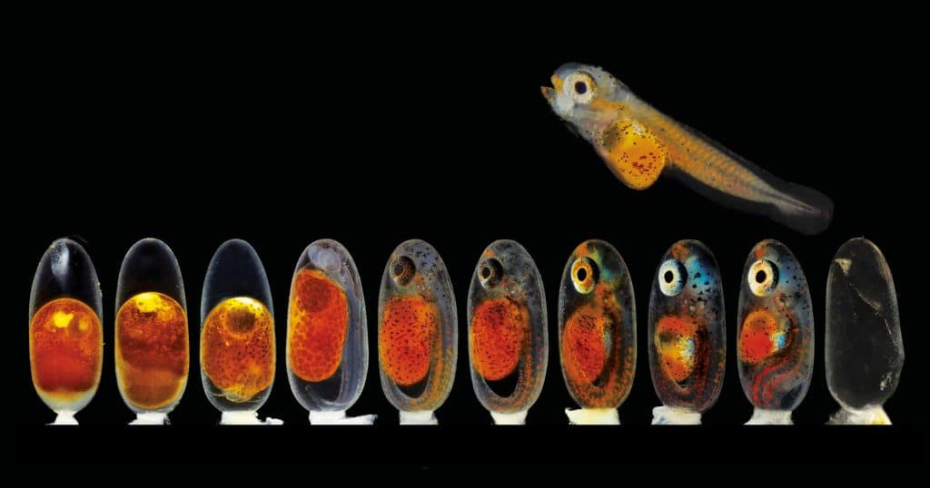 Embriões de peixe-palhaço (Amphiprion percula) em vários estágios de desenvolvimento. (Daniel Knop)