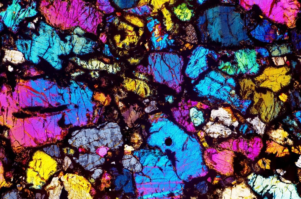 Nem todas as fotos consideradas eram de assuntos terrenos também. Uma imagem de outro mundo mostra uma fatia de meteorito em vidro colorido sob o microscópio.