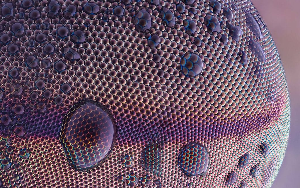 Seu premiado close-up, neste caso, pertence ao olho composto de uma mutuca. Em tal proximidade, cada hexágono sensível à luz pode ser visto, e cada um se combina para criar um padrão inacreditavelmente perfeito, ampliado às vezes pelo que parecem gotas de água.