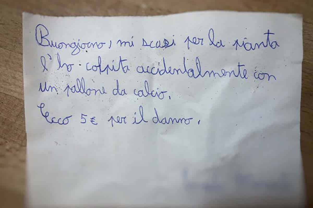 Uma planta danificada, uma nota de desculpas e 5 euros para pagar pelos danos. A história que estamos contando está circulando na web depois disso, Giovanni Grandi, professor de Filosofia em Pádua (Itália), publicou um tweet no qual ele mostra um pedaço de papel com esta frase: