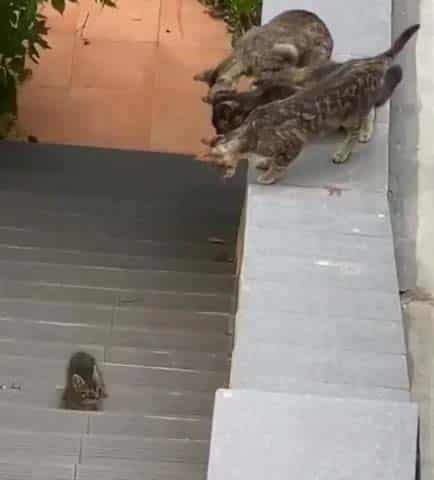 No vídeo, os gatos adultos estão numa parte mais alta; após constatarem que o pequeno não vai conseguir superar o obstáculo, um deles,(provavelmente a mãe) volta à parte mais baixa e aí começa o processo de resgate.